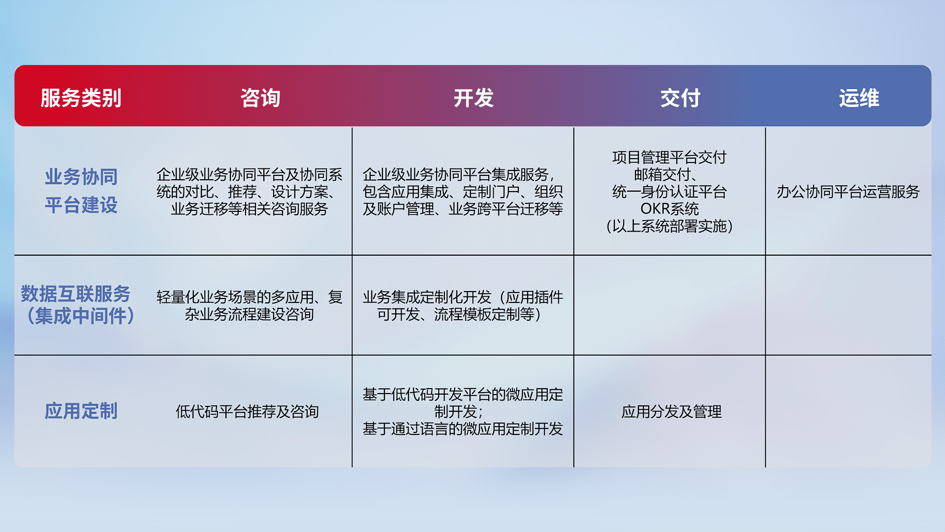 针对钉钉、、、企微、、IDaas等平台级产品提供产品的规划、、、方案、、交付、、、定制化开发等服务,,,实现如统一协同办公、、智能客户服务、、混合会议管理、、智能数据查询、、等业务场景,,实现数字化转型。。。。