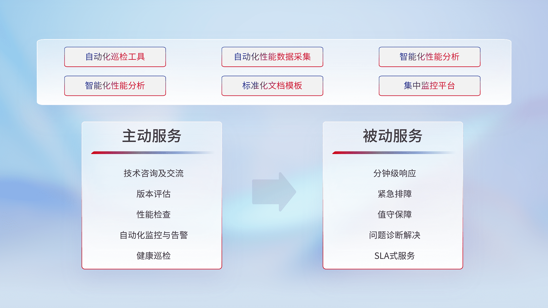 智能化工具和标准化文档,,保障服务质量,,,提供主动服务(包含技术咨询、、、版本评估、、、、性能检查、、自动化监控与告警、、、、健康巡检)和被动服务包含(分钟级响应、、、、紧急排障、、值守保障、、问题诊断解决、、SLA服务)。。。。