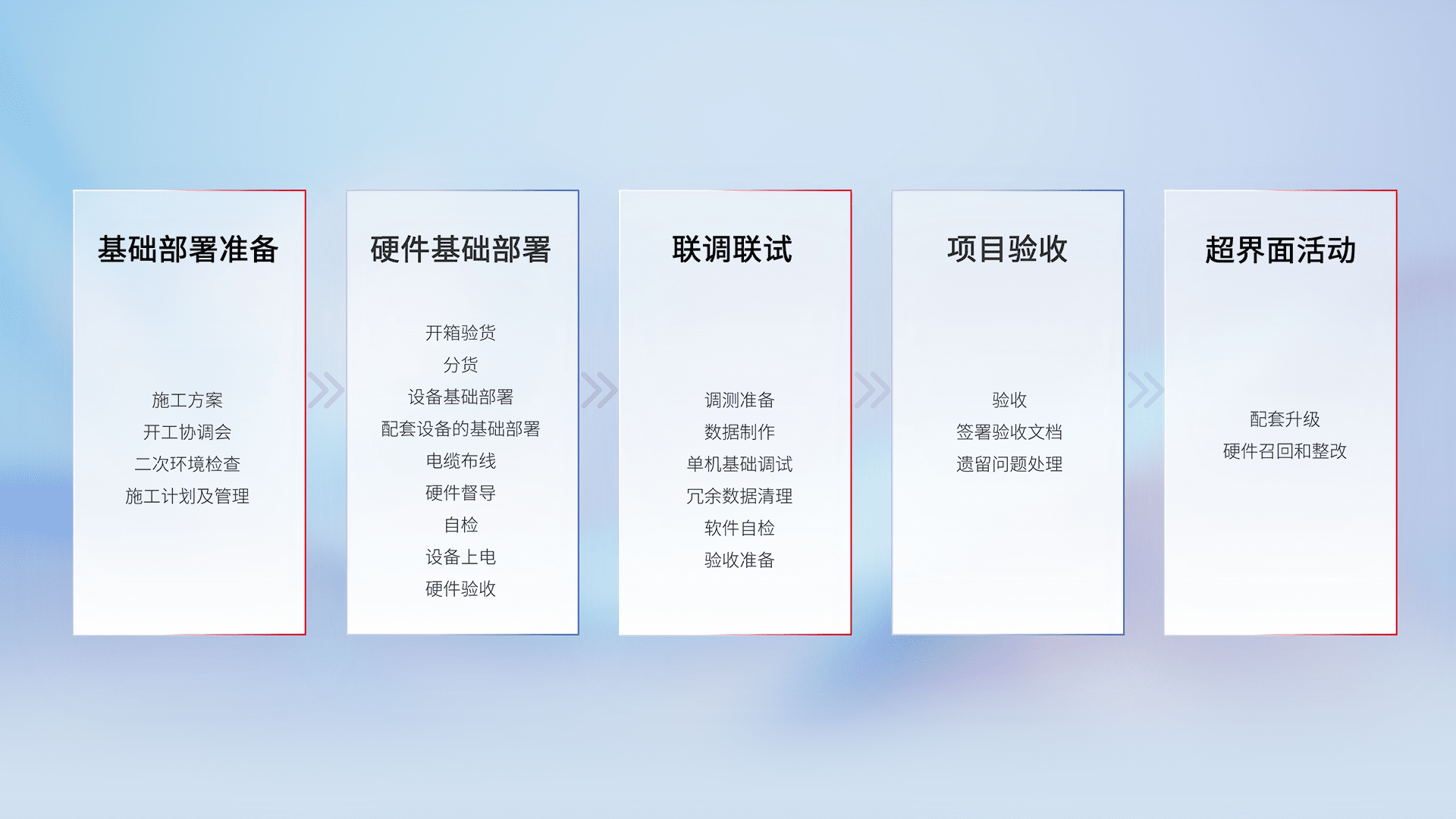 从基础部署准备、、、、硬件基础部署、、联调联试、、项目验收、、、、越界面活动的全过程可追溯,,,,保证施工质量和进度。。。